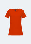 T-shirt classique pour femmes avec une encolure ronde finement coupée, des poignets étroits à la mode et une bande dans le cou. Fabriqué en jersey simple fin de poids moyen en coton peigné à longues fibres et filé à anneaux, pré-rétréci.